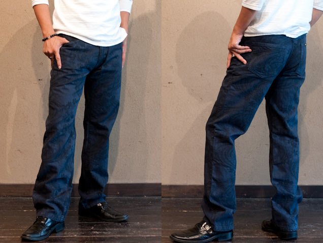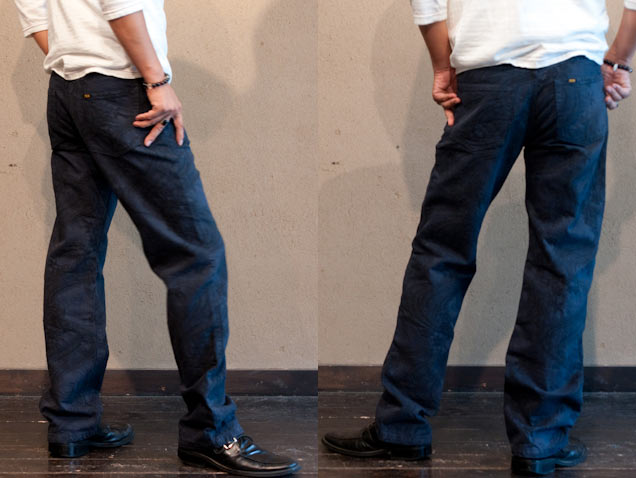 こちらは藍色よりも落ち着いた発色で、生地の文様がうっすらと見える上品な雰囲気です。普通のジーンズでは物足りない!という方におすすめの一本。さりがなく和を取り入れた商品ですので、どんなコーディネートでも楽しんでいただけます。