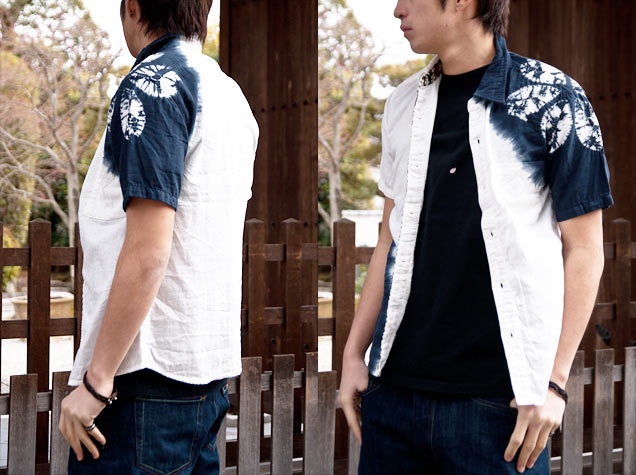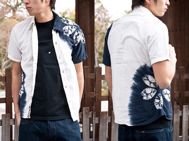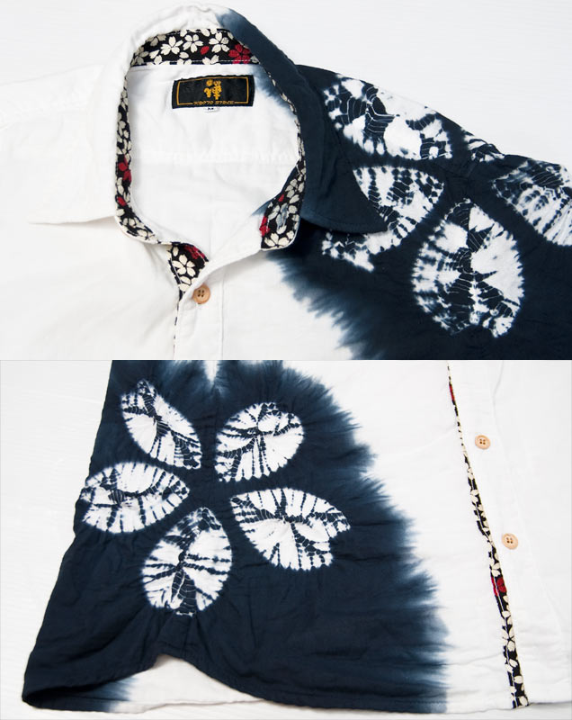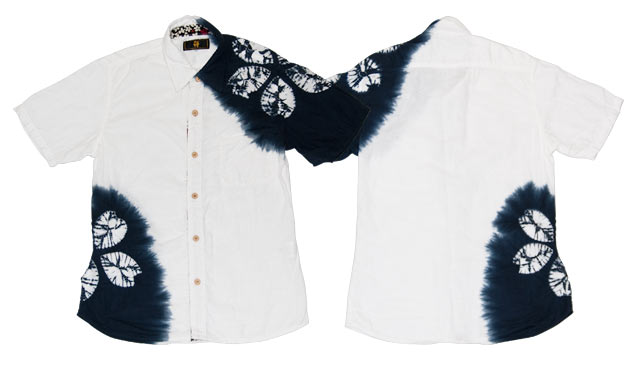 京鹿の子絞りの伝統工芸士が魅せる拘りのガーゼシャツ。傘巻きという技法で左肩と右脇を櫻模様に絞り、その周りだけを黒に染め幻想的な雰囲気を演出しています。和の技法がうまく洋装に昇華された、まさに和洋折衷の粋なシャツとなっております。大人のシャツでこの夏周りと差をつけてみませんか?
