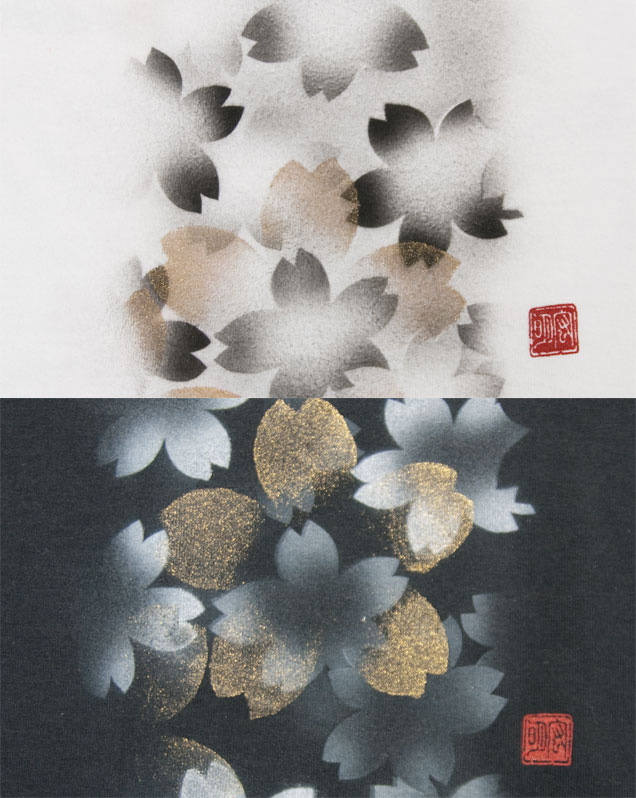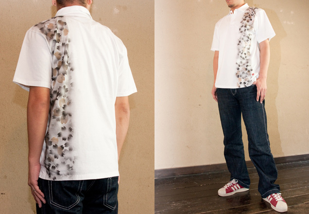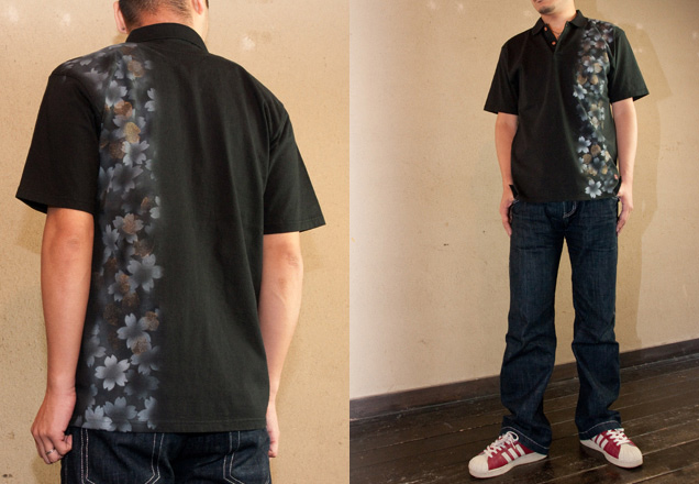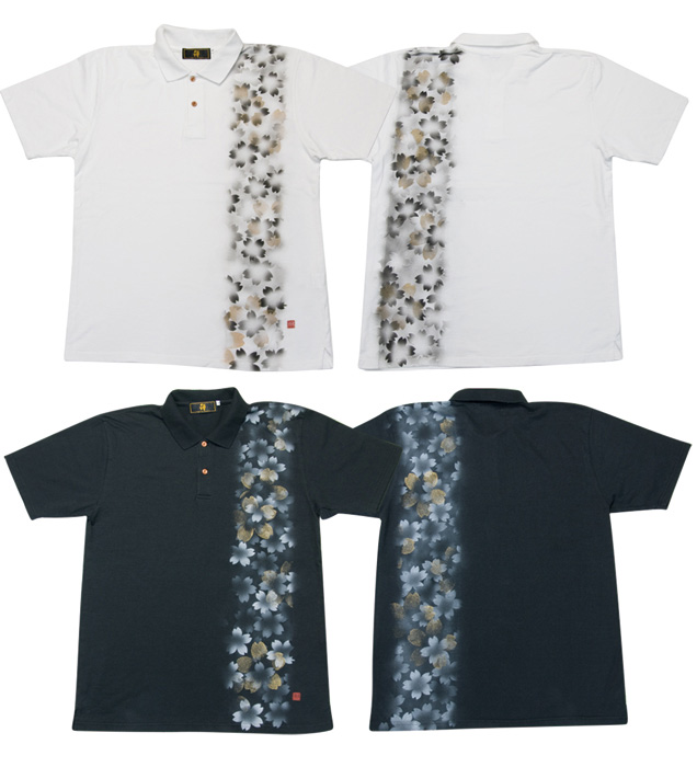 カジュアルなポロシャツに、幾重にも重ねられた版で幻想的な櫻を見事に表現しております。金のぼかし櫻が見え隠れし、デザイン性も高い一枚。カジュアルにも、上品にも着こなせます。手間をかけ一枚一枚前澤氏によって仕上げられた、贅沢なポロシャツです。