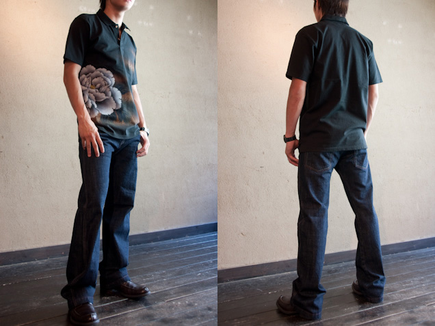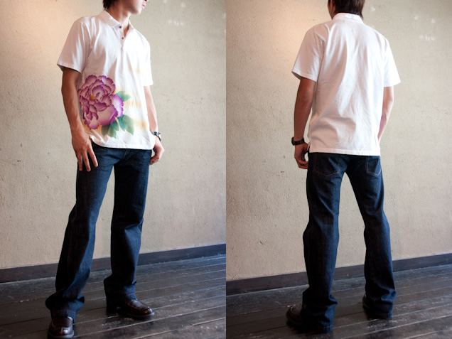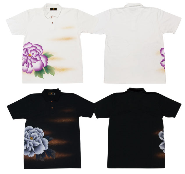 豪華な牡丹の花を京職人の卓越した技術で表現しました。百花の王と呼ばれる牡丹に相応しい大胆な色使い、計算されたぼかしやモチーフ、構造で老若男女問わずお勧めできる逸品です。大人気のポロシャツは、洗いをかけ風合いを出し、木目調ボタンで更に和の雰囲気を高めています。
