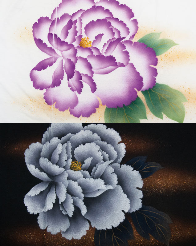 色の濃淡で花の奥行きを表現した、非常に繊細な作業を要する手染めです。大胆な構図が嬉しいですね。