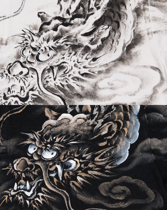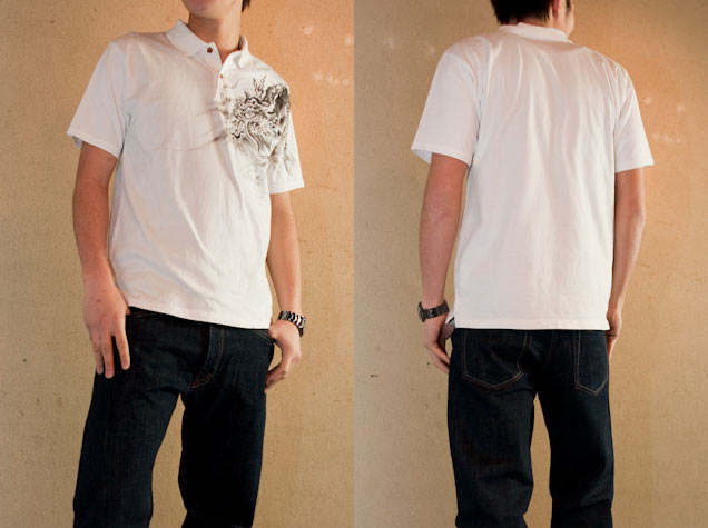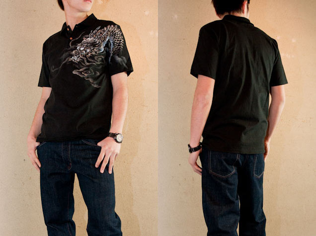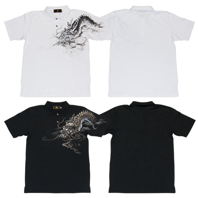 大好評いただいたTシャツの「雲龍」をポロシャツに!!左肩から顔を覗かす大胆な龍は迫力満点です!ポロシャツに水墨画風の筆のタッチで、かすれ具合など非常に味のある上品で高級感ある仕上がりになりました。