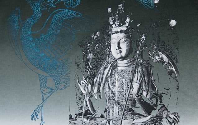 浮かび上がっているかのような表現の十一面観音像と、後ろには鳳凰が。十一面観音と鳳凰は、京都の平等院を連想しデザイン致しました。