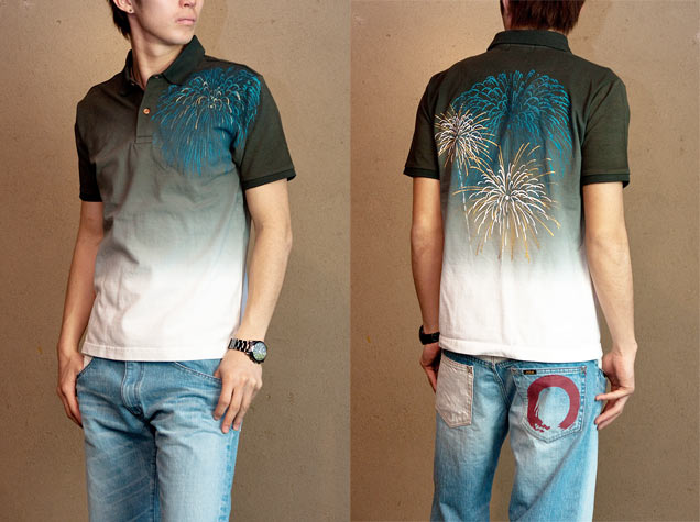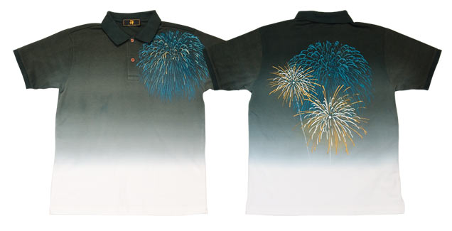 グラデーションを上手く利用したポロシャツ。夏の夜空に何発もの花火が打ち上げられた雰囲気を巧みに表現した季節感のある商品です。お祭りなどにも是非着ていきたい一枚ですね!