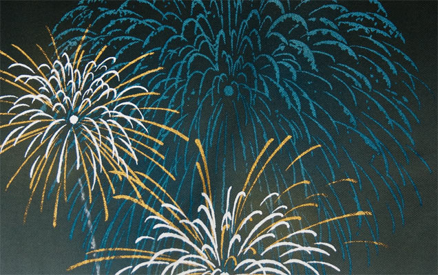 表現するのが難しい花火ですが、臨場感のある絵に仕上げるのはさすが職人熟練の技。まるで、打ち上げ花火が上がって消えていくまでの音が頭の中で反響するほど。夏を感じる一枚ですね。