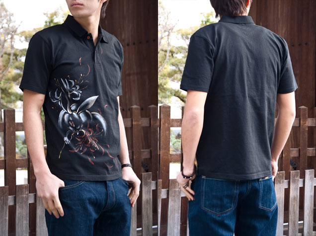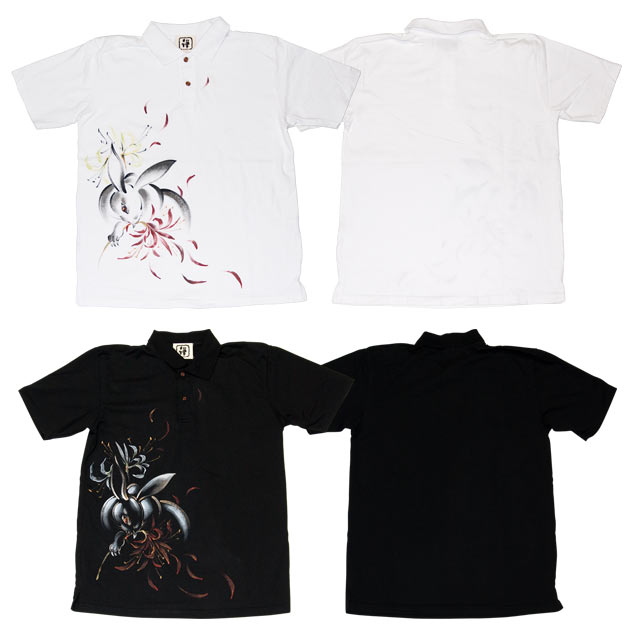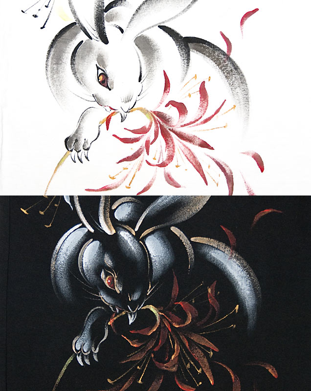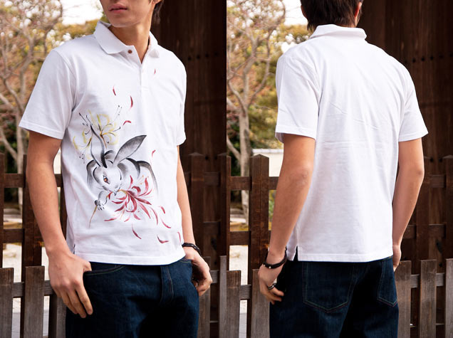 2011年の干支である兎をポロシャツに!死人花とも呼ばれ、毒性のある彼岸花。その彼岸花を咥え妖しげな表情をみせるこの兎は、優しいイメージの兎とは一線を画すものとなりました。このハードな兎をうまく着こなしてみては?