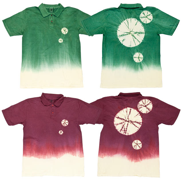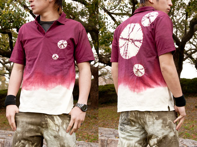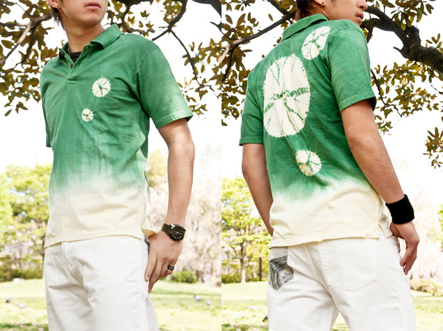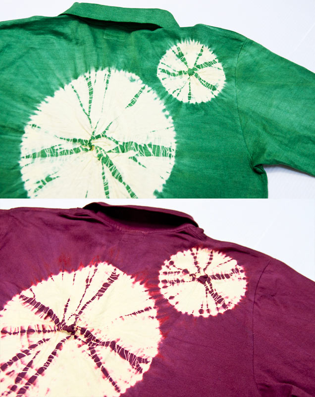 伝統技術である絞り染め技法を使ったポロシャツが登場。傘巻きという手法の絞り染めとぼかし染めを併用することで色鮮やかなポロシャツに仕上がりました。花火をイメージした背面の模様にも注目!