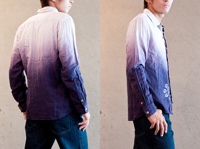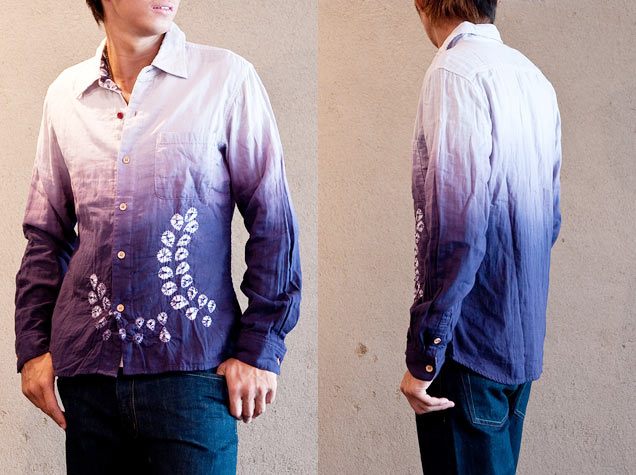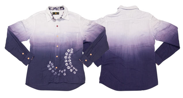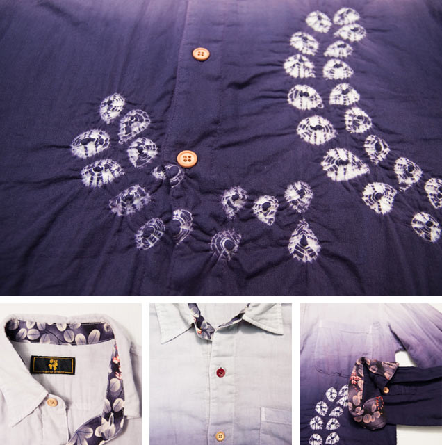 綿の柔らかいダブルガーゼシャツを、京鹿の子絞りの職人が丹念に染め上げました。藤をひとつひとつ絞り、さらに二色染めで綺麗な紫のグラデーションを表現した、贅沢で非常に上品なシャツです。これからの季節さっと羽織れるガーゼシャツ、おひとついかがでしょうか。