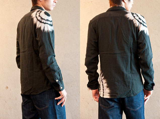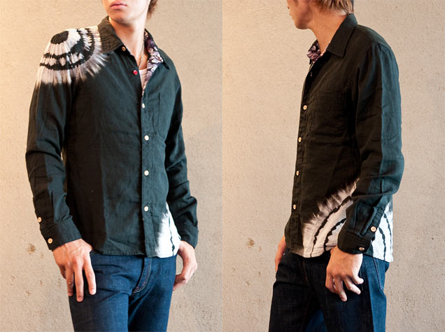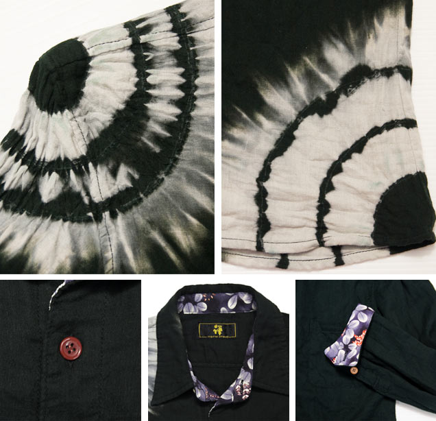 綿の黒のダブルガーゼシャツを、絞りと抜染の今までの禅にない手法で表現致しました。前立てなどの裏地に紫の生地を使用しているため、黒の色を抜いた後には色を入れず、シンプルな表現に留めております。ですが、肩口と裾に大胆に入れられた模様はしっかりとした存在感があります。