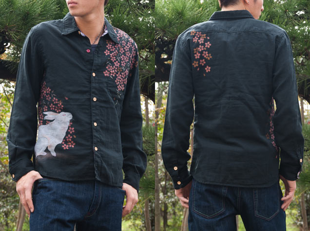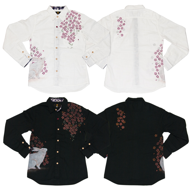 どこか神秘的な雰囲気を漂わせる上品な兎と、華やかな櫻を散らしとてもデザイン性の高いこの絵柄。メンズのロンTでご好評いただいておりましたこの絵柄、シャツになってリリースです!