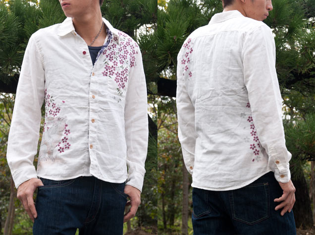 肩・腰にまんべんなく染められた櫻は、計算された美しさ。春にも着れるこのシャツ、持っていて損はない一枚です。