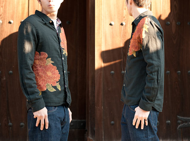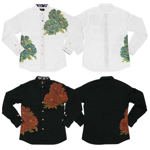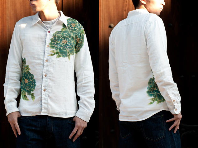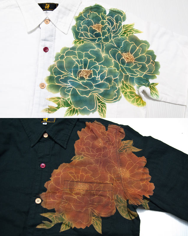 禅オリジナルのダブルガーゼシャツに、鮮やかな牡丹を染め上げました。柔らかな手触りや形の良さが、リリースから上質を好むお客様に大好評いただいております。肩口と腰部分に大きく大胆に配置された百花の王牡丹。ふわりとした淡い独特の雰囲気を持ち合わせています。