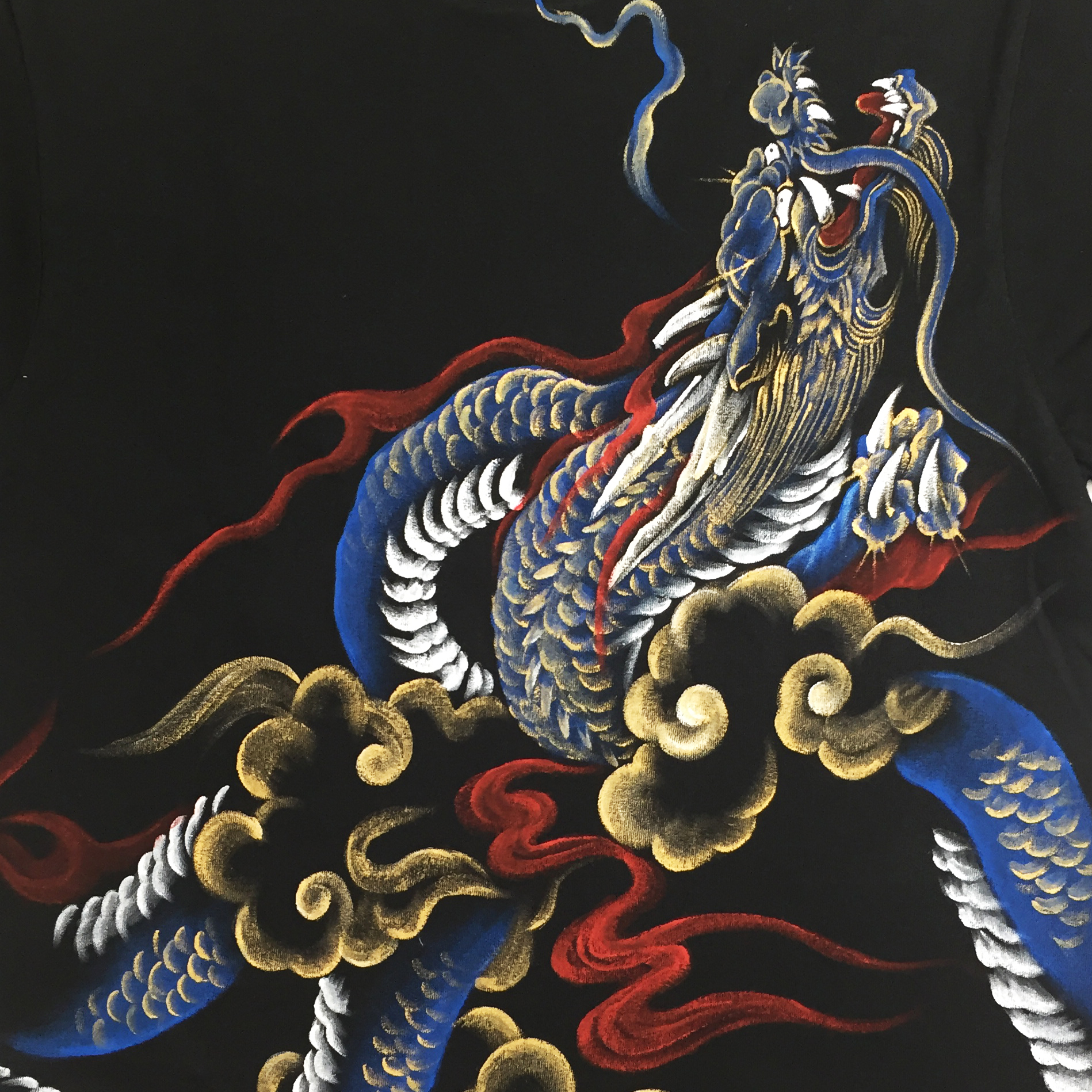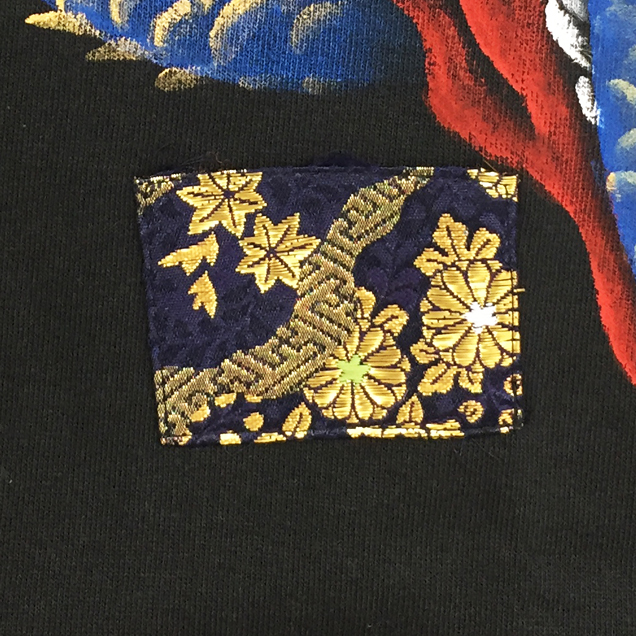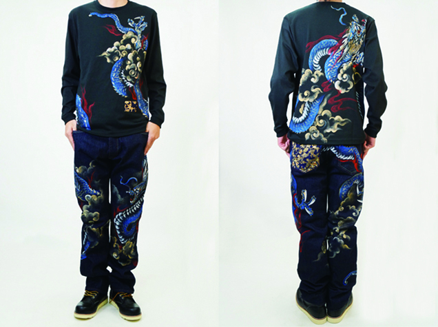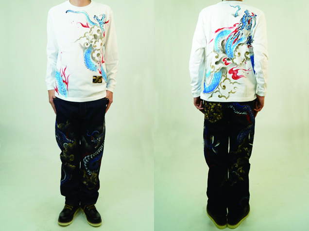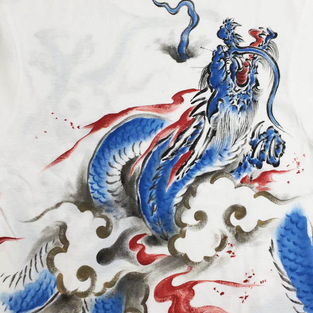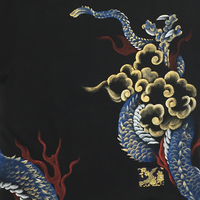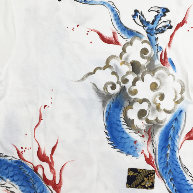 Tシャツというキャンパスの上で縦横無尽に踊る青龍神。前にも後ろにもかなりのボリュームで手描きされており迫力満点の商品に仕上がりました。腰部分にアクセントとなる金襴を貼り付けているのもポイントです。同じ柄の青龍神のジーンズを合わせて着るとまわりの目を引き付ける事間違いなしです!尚、コチラの商品は総生産数100枚の数量限定商品です。受注総数が100枚に達した時点で生産を終了させて頂きますので気になる方はお早めに!