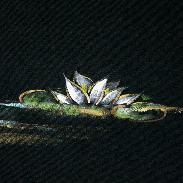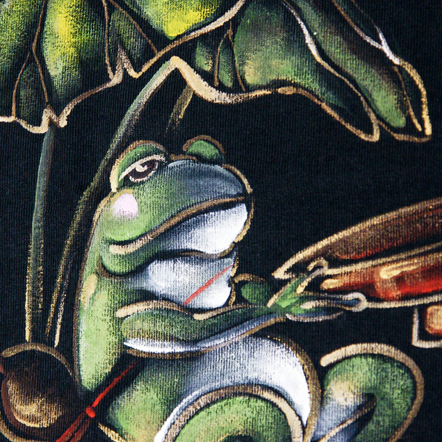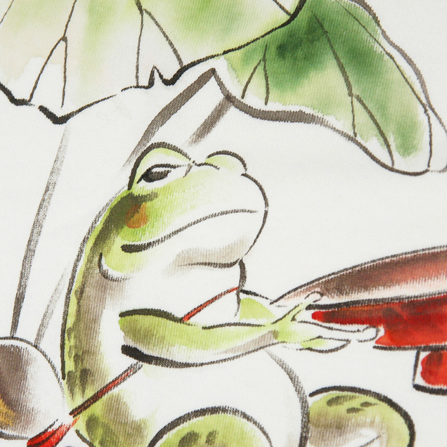 石の上に座り酒を飲む蛙を手描きした半袖Tシャツ。やわらかいタッチの絵柄は見ている人が思わずにやけてしまうほど可愛らしく