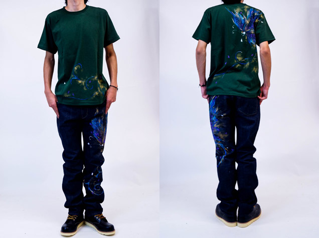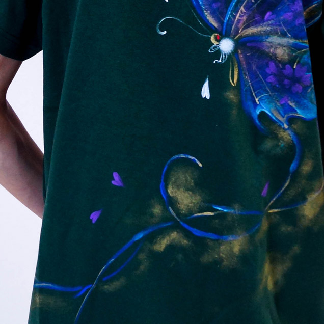 ジーンズ同様、幻想的な蝶々が独特尾世界観を晒し出す!Tシャツのカラーも珍しいグリーンをチョイス。