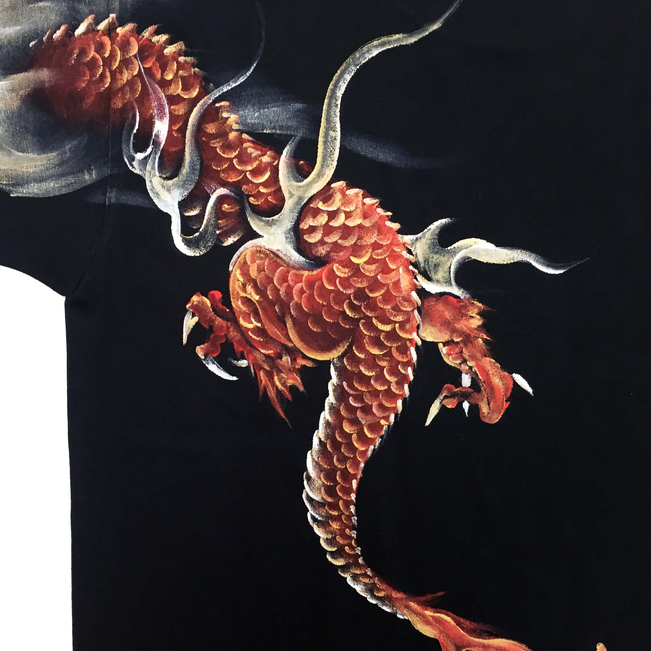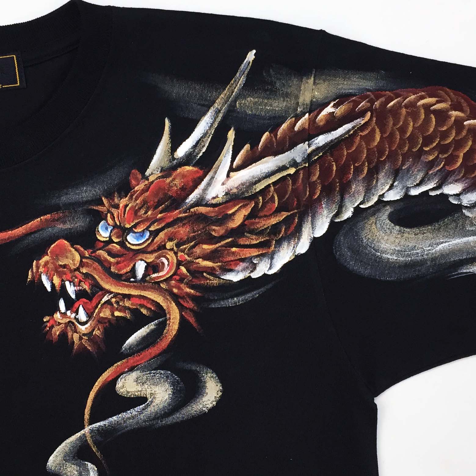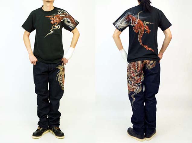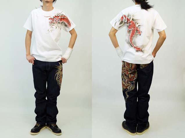 前後両面に赤龍が描き込まれた贅沢なTシャツ。ジーンズやワークシャツ同様、赤龍という珍しい配色が新鮮です。顔は勿論ですが背中に描かれた赤龍の胴体が躍動感に溢れ力強さを感じさせます。