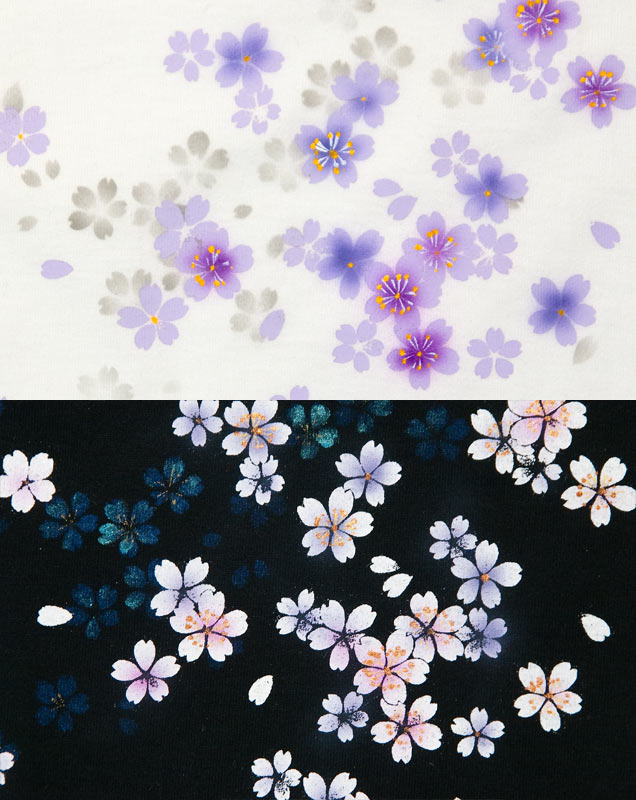 白は、まるで水彩画のような雰囲気の淡い色調で染められています。黒はシンプルながらも様々な色が使われていて、華やかな印象です。