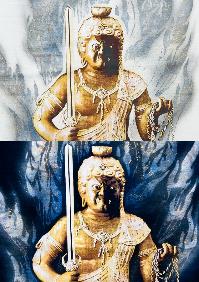 不動明王のデザインは和柄では定番になりがちですが、ほとんどの不動明王が赤黒色や青黒色をしています。