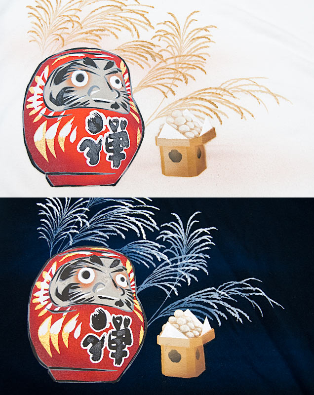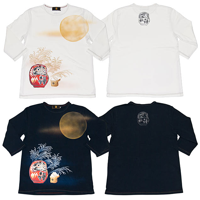 秋らしい背景のススキに、禅の文字が入った達磨さんがお月見をしている姿が描かれています。優しいタッチで描かれていて、幻想的な風景が頭に思い浮かびます。"七転び八起き"で縁起が良いとされる達磨さんTは、強く逞しくなれるようですね。