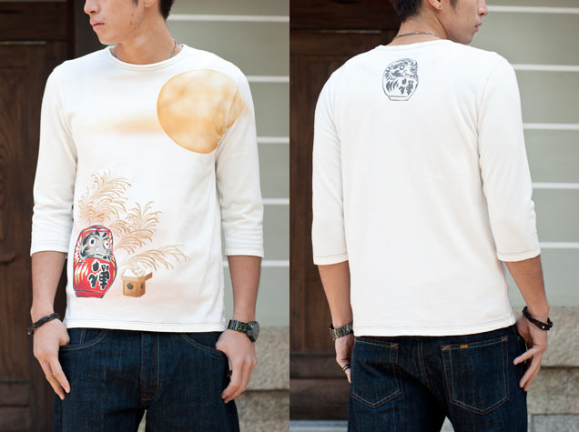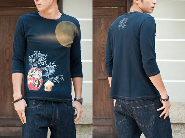 ボディーである七分丈Tシャツは全てこだわりの国産で、今秋から素材と形をを変えリリース致します。生地は、厚みのある柔らかい綿の生地を使用。ステッチで侘び・寂びを表現し、和の雰囲気をさらに演出しています。