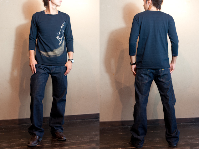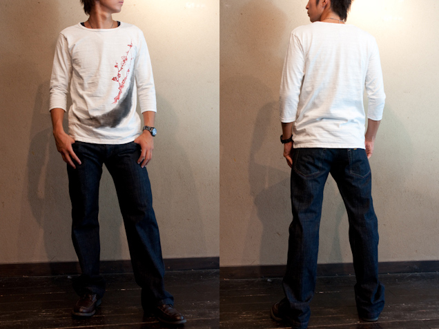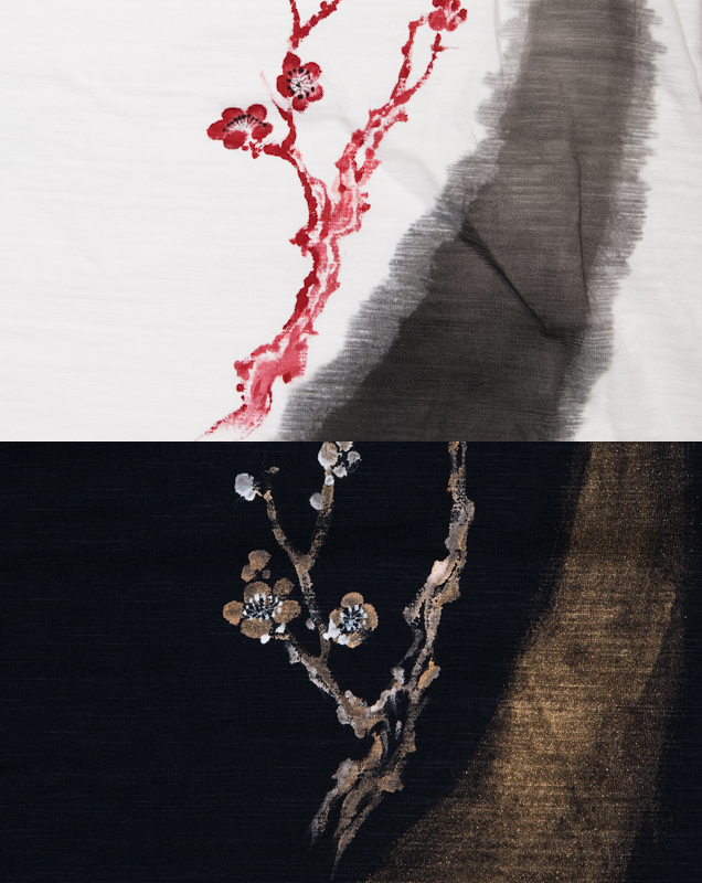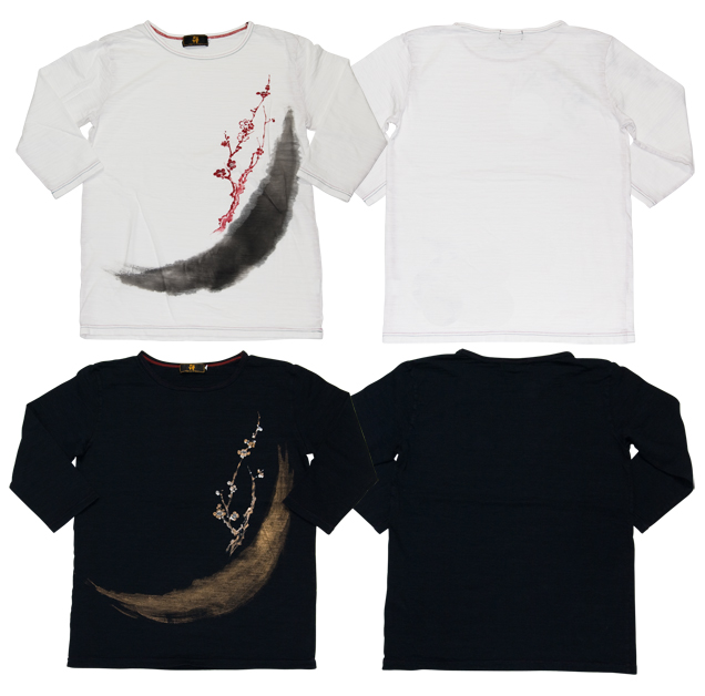 墨絵調の、一筆描きを表現。その上には日本の代表花である梅が伸びている様が描かれています。斬新さと洗練されたデザインで、古来よりの伝統を現代のファッションに反映しました。また、上に伸びる梅というのは縁起が良いとされ、贈り物にもピッタリの一枚です。ボディーである七分丈Tシャツは、全てこだわりの国産で、ムラ感ある柔らかい生地が特徴です。ステッチで侘び・寂びを表現し、和の雰囲気をさらに演出しています。