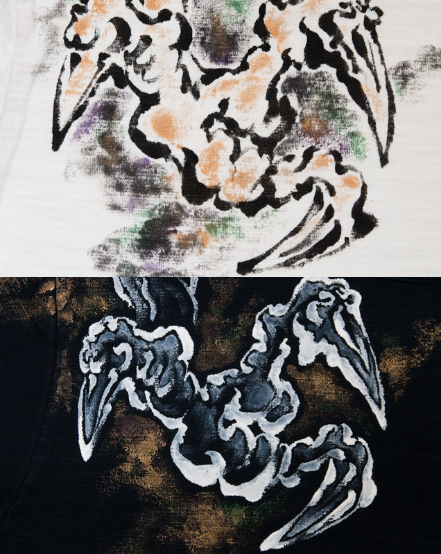 右肩に伸びる龍の手を大胆に手描きしました。肩から袖にかけて描かれて龍手と雲がインパクト大です!あえて龍全体ではなく迫りくる龍の手のみを描き、龍の巨大さをイメージさせる斬新な構図。龍柄という派手なモチーフながら、今までの禅にはない様々な色使いで描くことでPOPな雰囲気と怪しげな雰囲気を兼ね備えた商品となりました。