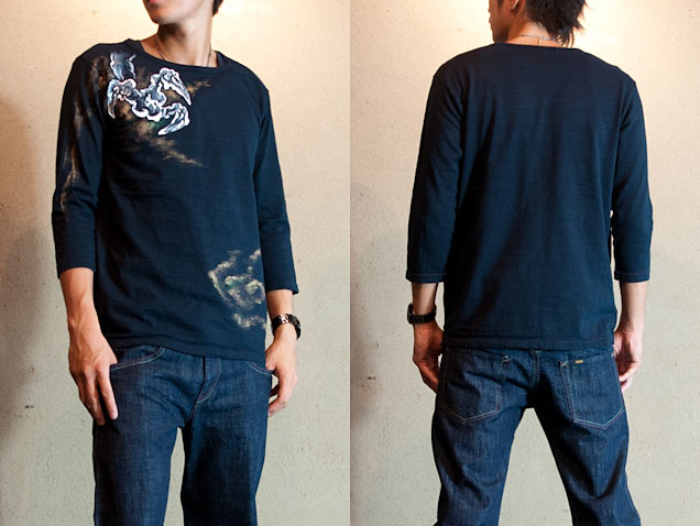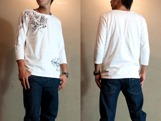 ボディーである七分丈Tシャツは、全てこだわりの国産で、ムラ感ある柔らかい生地が特徴です。ステッチで侘び・寂びを表現し、和の雰囲気をさらに演出しています。