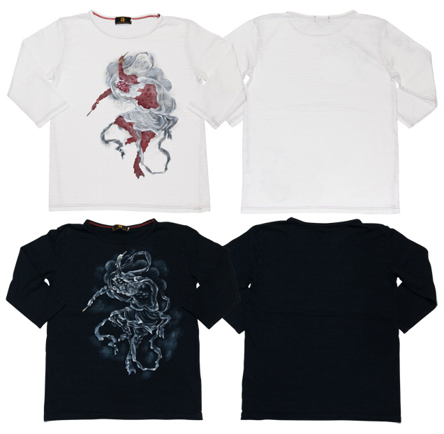白Tシャツは、渋いカラーで描かれた雷神が、黒はモノトーンに金彩が入れられた上品なカラーで描かれています。どちらも違う雰囲気をもつTシャツです。