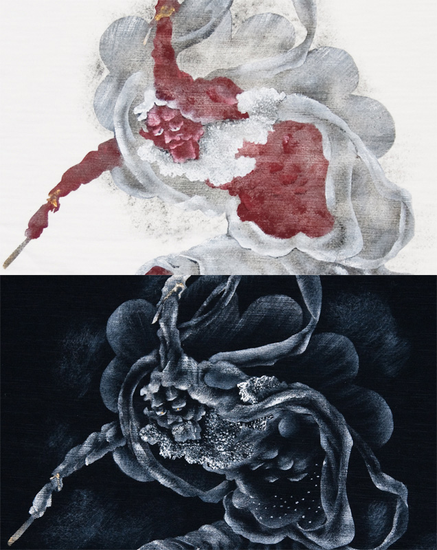 和柄では、風神と対で描かれることの多い定番柄の雷神。今回は雷神のみを大胆に手描きしました。白地は色を使い、黒地をモノトーンで表現することで、全く違った雰囲気に仕上がった手描き感溢れる1枚です。動きのある羽衣や雲が雷神の躍動感を漂わせています。