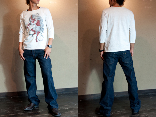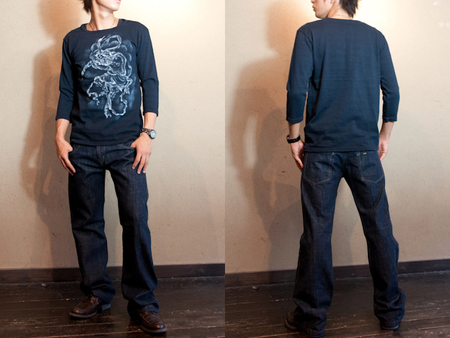 ボディーである七分丈Tシャツは、全てこだわりの国産で、ムラ感ある柔らかい生地が特徴です。ステッチで侘び・寂びを表現し、和の雰囲気をさらに演出しています。