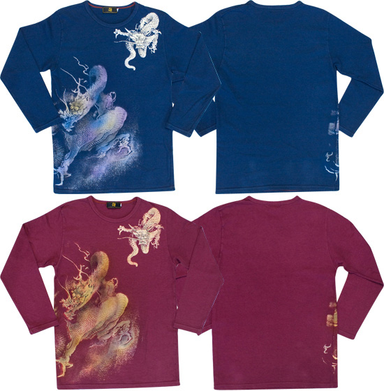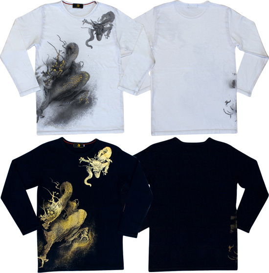 最終工程で職人の手によって色づけされている為、そこらの龍柄Tシャツとはひと味違う!!白は抜染では無く、プリントと筆を使い、墨絵風に仕上げています。