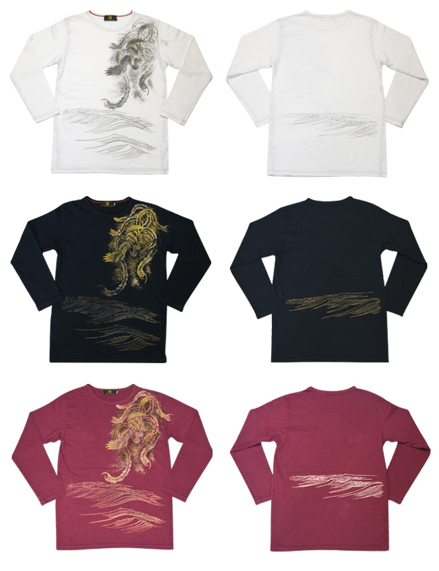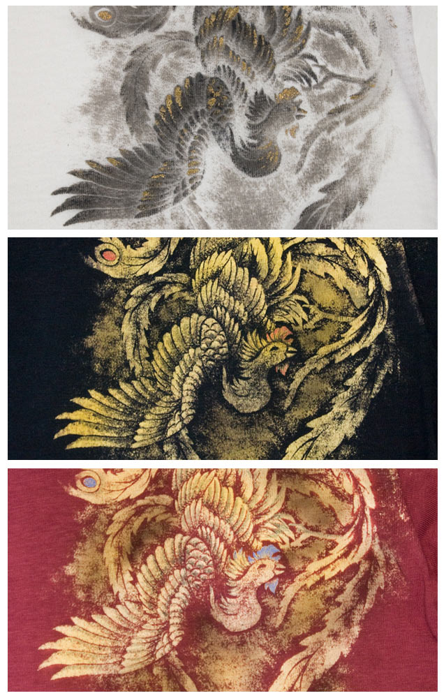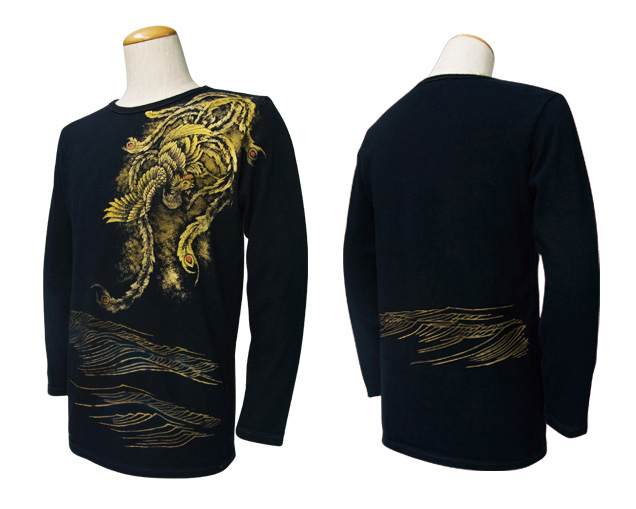 抜染後更に手を加えたこだわりの商品です。肩から胸にかけての大胆な鳳凰の柄は和柄好きにはたまらないデザイン。前と後に入った波柄がポイントになっており、迫力のある構成です。