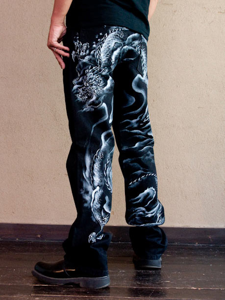 ブラックジーンズの後一面に描かれた、白い神秘的な龍です。